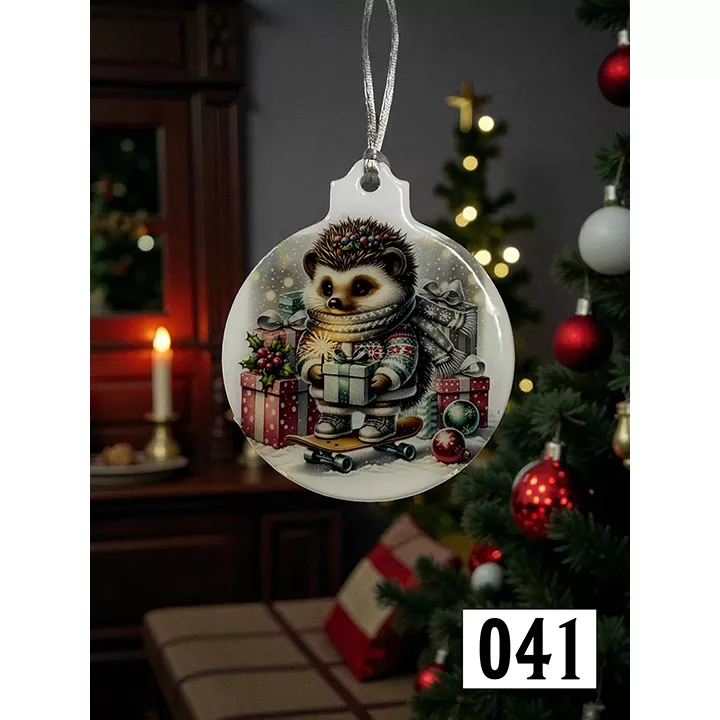 Hand poured resincrete christmas tree ornaments with high quality uv stickers, topped with a uv resin dome. The backs and sides are polished to make them water resistante and finished off with a satin look hanging nylon cord. No two are alike.
