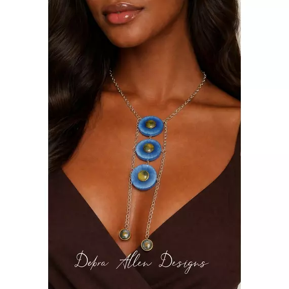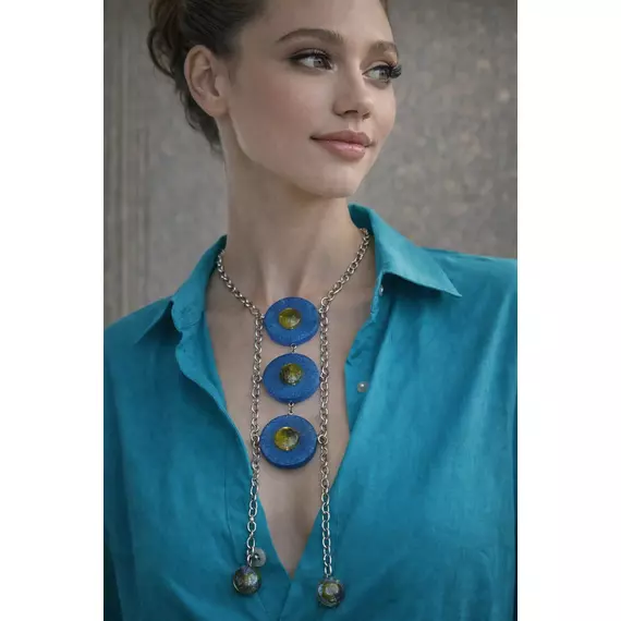Featuring textured cobalt-blue resin discs accented with multi-coloured  centers, this striking vertical design creates a sculptural silhouette that elongates the neckline. The dual chain drop adds movement and balance, while the metallic detailing catches the light with every turn.
