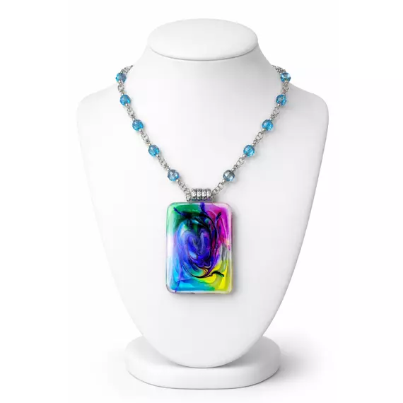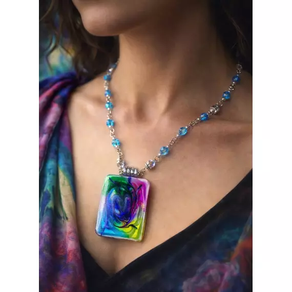 The Necklace features a striking resin pendant infused with vibrant swirls of electric blue, emerald green, magenta, violet, and golden yellow. Each piece carries a unique abstract flow, making every necklace one-of-a-kind.