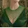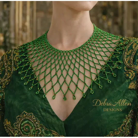 Commanding yet elegant, a bold expression of heritage, artistry, and feminine strength. Handwoven in vivid emerald beads with delicate gold accents and metal, this dramatic fan-shaped silhouette frames the neckline like a regal crown. It transforms even the simplest silhouette into something powerful and unforgettable.