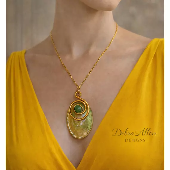 Textured oval resin pendant in green and gold tones