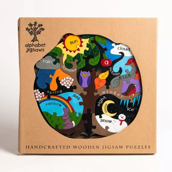 Our Seasons wooden jigsaw puzzle comes beautifully packaged in a cardboard presentation box and we include a drawstring cotton bag for storage after play.