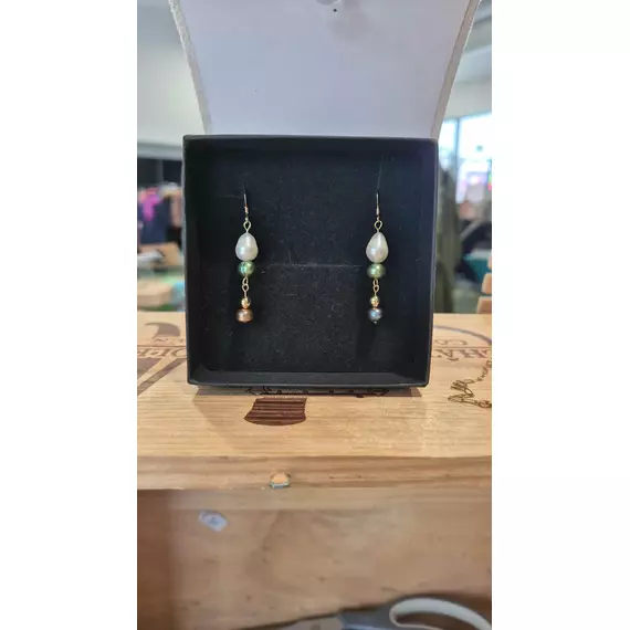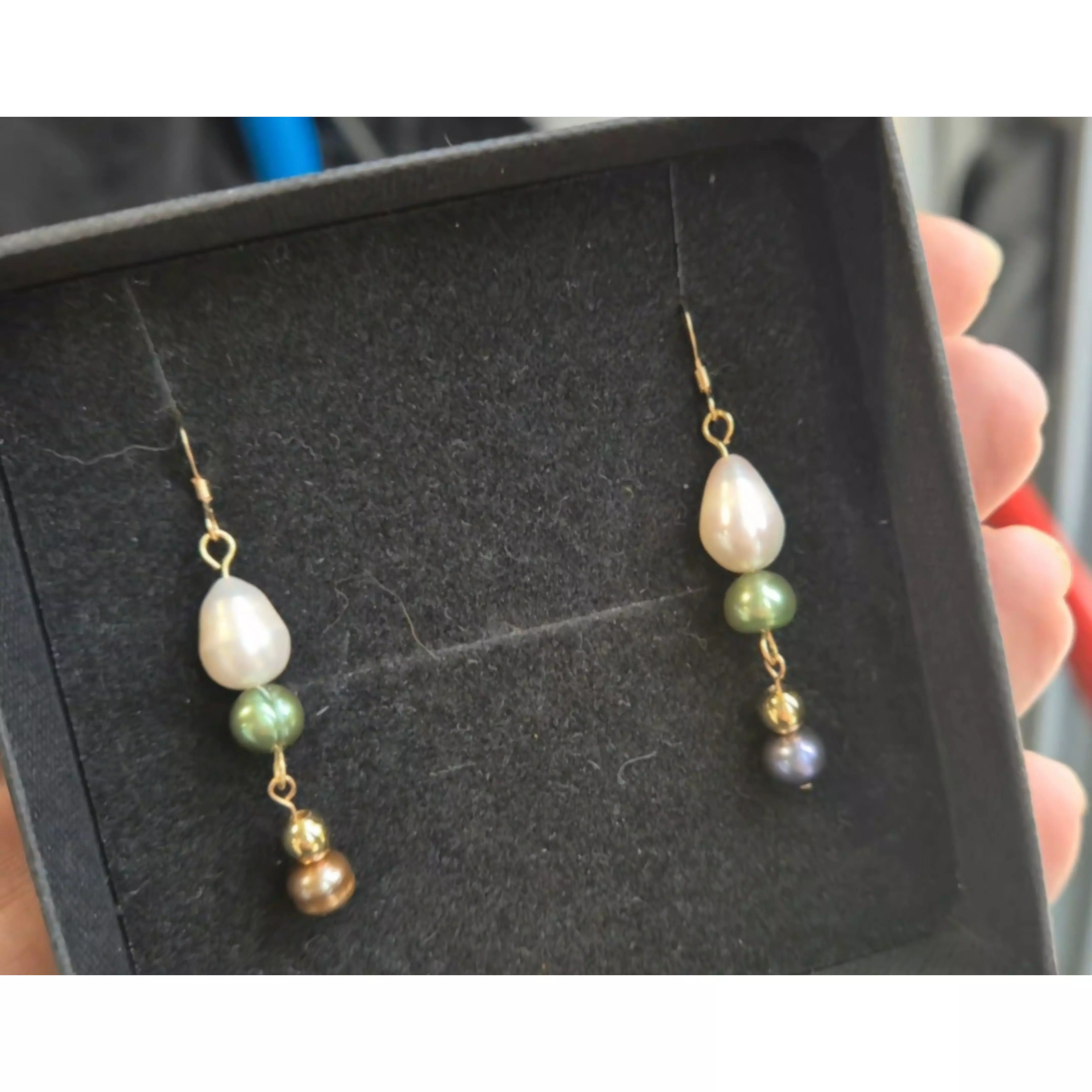 Bring a touch of timeless elegance to your everyday look with these handcrafted drop earrings. Featuring Grade AAA freshwater pearls paired with rich green and chocolate tones, each earring is strung on 14k gold-filled wire for a lasting, tarnish-resistant finish.