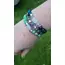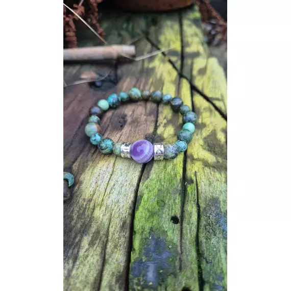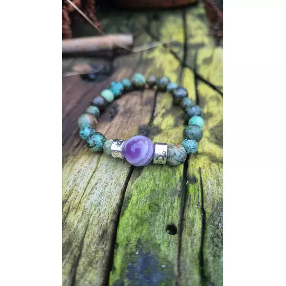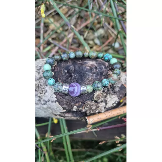 This handcrafted stretch bracelet pairs natural Imperial Jasper beads in rich mossy greens with a smooth Amethyst centre stone, creating a balance between grounding earth tones and gentle clarity. Subtle silver-tone spacer beads frame the amethyst focal, adding a quiet decorative detail without overpowering the natural stones.