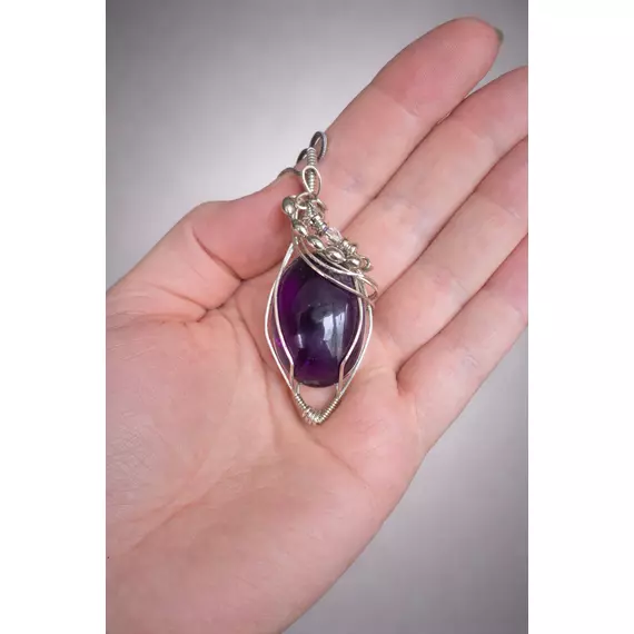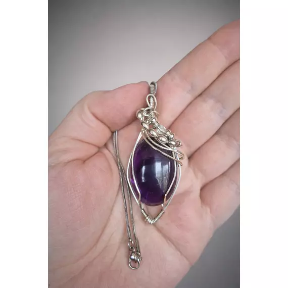 A deep violet amethyst cabochon, wrapped by hand in flowing silver-plated wire, shaped into an elegant, leaf-like cradle. This piece feels regal and protective — like something unearthed from an old apothecary chest or worn by a modern mystic.