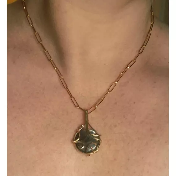 A simple, elegant pendant featuring a round labradorite cabochon wrapped in 14k gold-filled wire. The design is secure, minimal, and lets the natural colour of the stone speak for itself. The pendant hangs on an 18-inch gold-filled paperclip chain that’s lightweight, comfortable, and easy to wear every day.