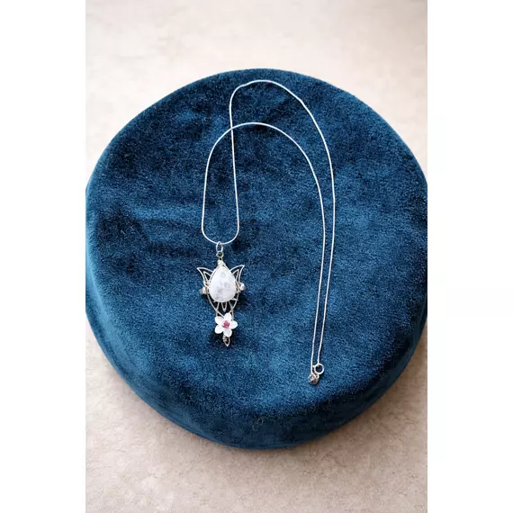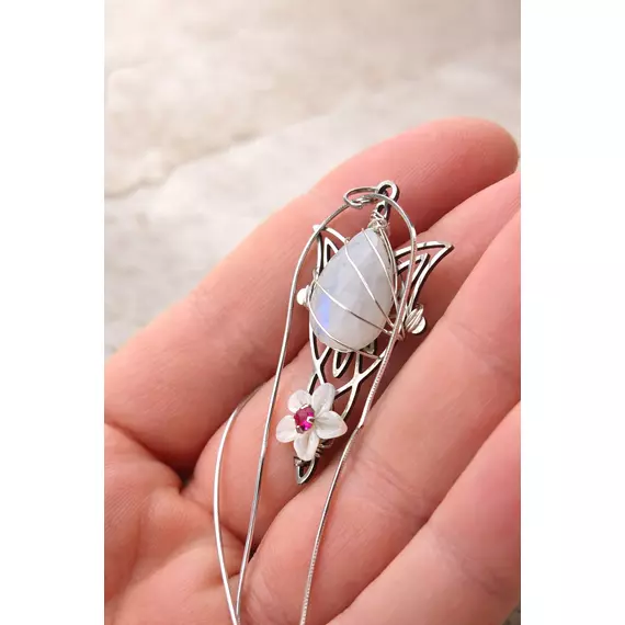 A luminous teardrop moonstone rests at the heart of this intricate stainless steel pendant, wrapped in delicate silver wire and framed in an elegant, fairy-inspired design. Beneath it blooms a hand-set mother of pearl flower, finished with a vivid pink primero detail gem for a subtle flash of colour.