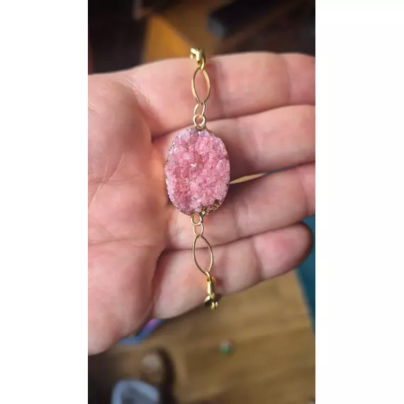 This delicate yet eye-catching bracelet features a natural pink druzy quartz crystal, electroplated in gold and paired with a high-quality 14k gold filled chain. The fine crystalline surface catches the light beautifully, giving a subtle shimmer rather than an overpowering shine.