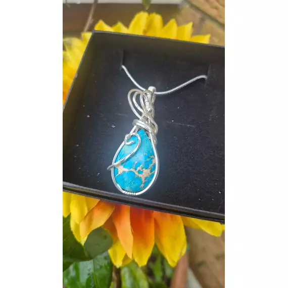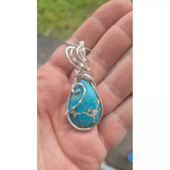 The teardrop cabochon is hand-wrapped in flowing silver-plated wire, shaped into sculptural curves that secure and frame the stone while allowing its natural pattern to remain the focal point.