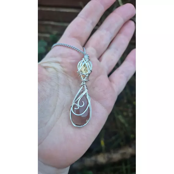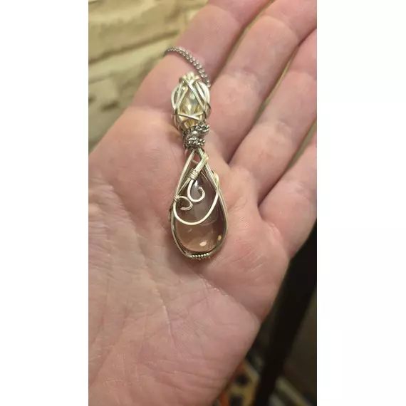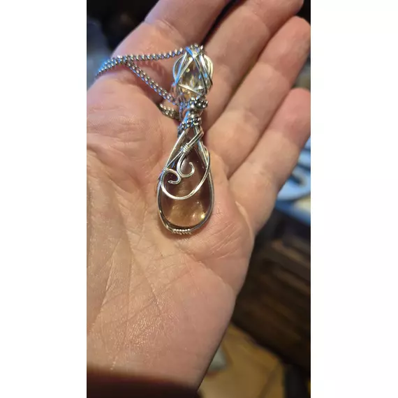 A deep, translucent Smoky Quartz anchors the design, hand-wrapped in flowing silver-tone wire that follows the natural curves of the stone. Above it sits a luminous Aurae Crystal accent, catching and refracting light like a quiet flame held in metal.