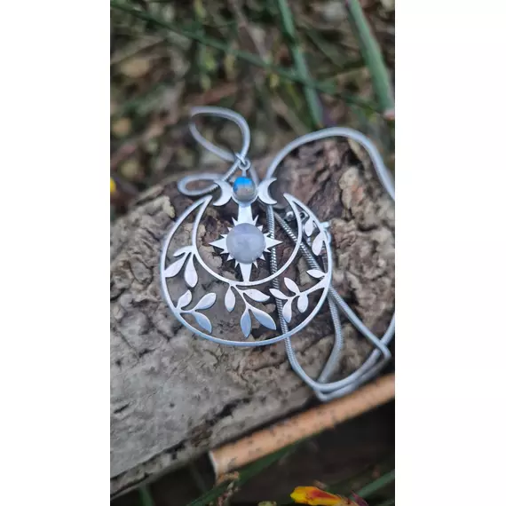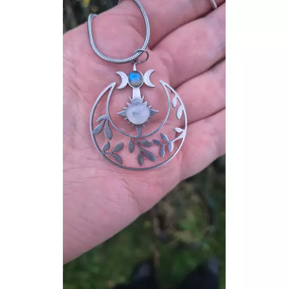 This crescent moon pendant weaves together moonstone and labradorite — two stones that represent cycles, growth, and wisdom. They are framed by delicate botanical cut-outs finished in brushed stainless steel.
