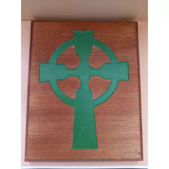 Product details: Material Mahogany wood plaque. Size 18 cm x 24 cm. Finish Celtic green cross design on natural mahogany background. Handcrafted in Ireland.