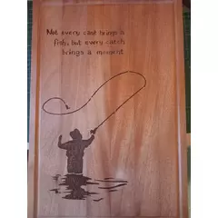 Hand-burned pyrography chopping board featuring a carefully drawn-out Fly Fisherman across natural wood grain. The lettering flows along the board, creating a rustic and warm kitchen piece that is both decorative and functional.  Each design is individually burned by hand, making every board...