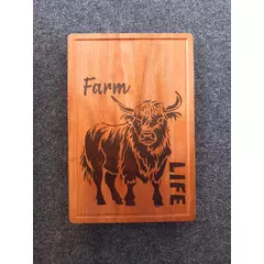 Hand-burned pyrography chopping board featuring a carefully drawn-out Bull across natural wood grain. The lettering flows along the board, creating a rustic and warm kitchen piece that is both decorative and functional.  Each design is individually burned by hand, making every board unique....