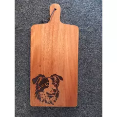 Hand-burned pyrography chopping board featuring a carefully drawn-out SheeepDog across natural wood grain. The Image flows along the board, creating a rustic and warm kitchen piece that is both decorative and functional.  Each design is individually burned by hand, making every board unique....