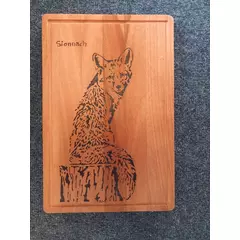 Hand-burned pyrography chopping board featuring a carefully drawn-out Fox across natural wood grain. The lettering flows along the board, creating a rustic and warm kitchen piece that is both decorative and functional.  Each design is individually burned by hand, making every board unique....