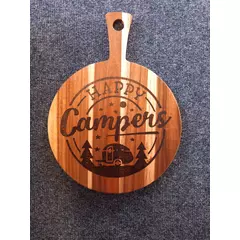 Hand-burned pyrography chopping board featuring a carefully drawn-out Happy Campers Logo across natural wood grain. The lettering flows along the board, creating a rustic and warm kitchen piece that is both decorative and functional.  Each design is individually burned by hand, making every...