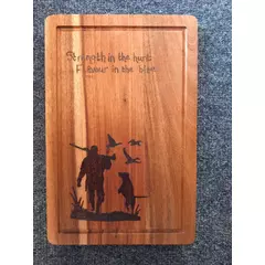 Hand-burned pyrography chopping board featuring a carefully drawn-out Fisherman across natural wood grain. The lettering flows along the board, creating a rustic and warm kitchen piece that is both decorative and functional.  Each design is individually burned by hand, making every board unique....