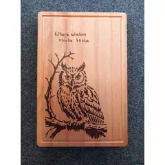 Hand-burned pyrography chopping board featuring a carefully drawn-out Owl across natural wood grain. The lettering flows along the board, creating a rustic and warm kitchen piece that is both decorative and functional.  Each design is individually burned by hand, making every board unique....