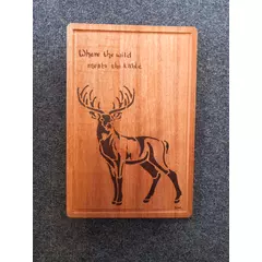 Hand-burned pyrography chopping board featuring a carefully drawn-out stag across natural wood grain. The lettering flows along the board, creating a rustic and warm kitchen piece that is both decorative and functional.  Each design is individually burned by hand, making every board unique....