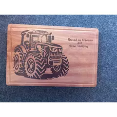 Hand-burned pyrography chopping board featuring a carefully drawn-out Tractor across natural wood grain. The lettering flows along the board, creating a rustic and warm kitchen piece that is both decorative and functional.  Each design is individually burned by hand, making every board unique....