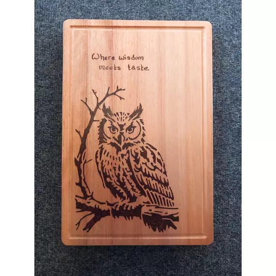 Hand-burned pyrography chopping board featuring a carefully drawn-out Owl across natural wood grain. The lettering flows along the board, creating a rustic and warm kitchen piece that is both decorative and functional. Each design is individually burned by hand, making every board unique. Product size 45cm x 30cm x 2cm
