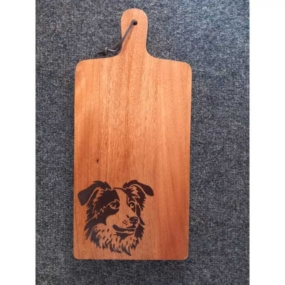 Hand-burned pyrography chopping board featuring a carefully drawn-out SheeepDog across natural wood grain. The Image flows along the board, creating a rustic and warm kitchen piece that is both decorative and functional. Each design is individually burned by hand, making every board unique. Product size 18in x 8in product can also have dogs name incorporated