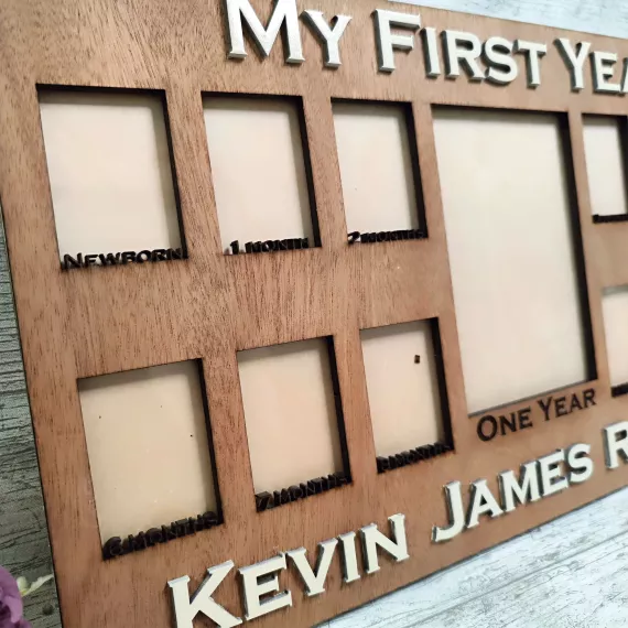 Celebrate and cherish the special moments from your little one's first year with this beautiful handcrafted wooden photo frame.