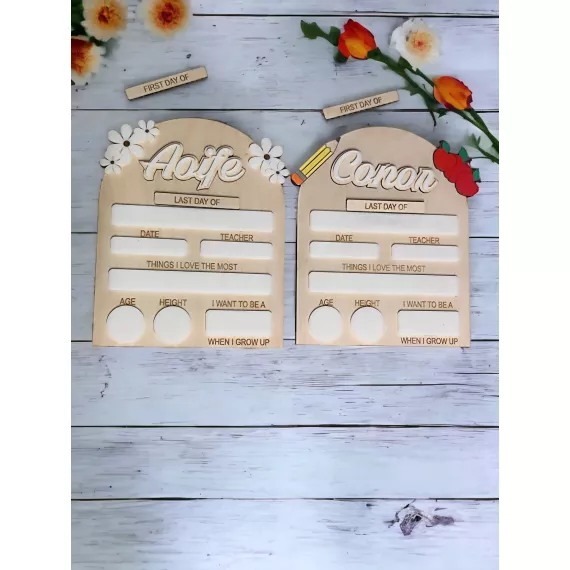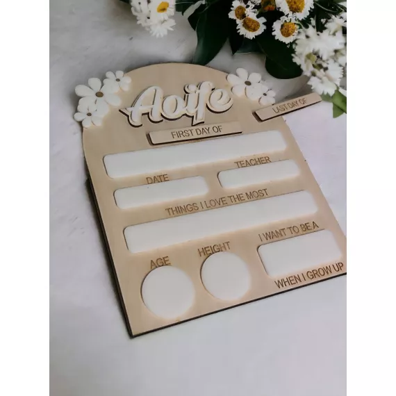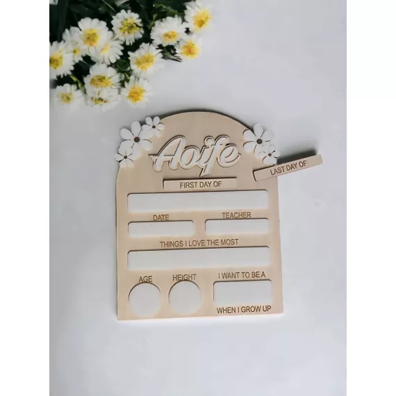 The sign features a beautiful daisy design and a convenient dry erase surface, making it reusable year after year. Simply wipe it clean and customize it with your child's grade, school name, and date. It's a personalised keepsake that will bring a smile to your face every time you see it.
