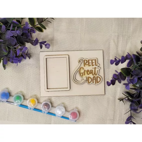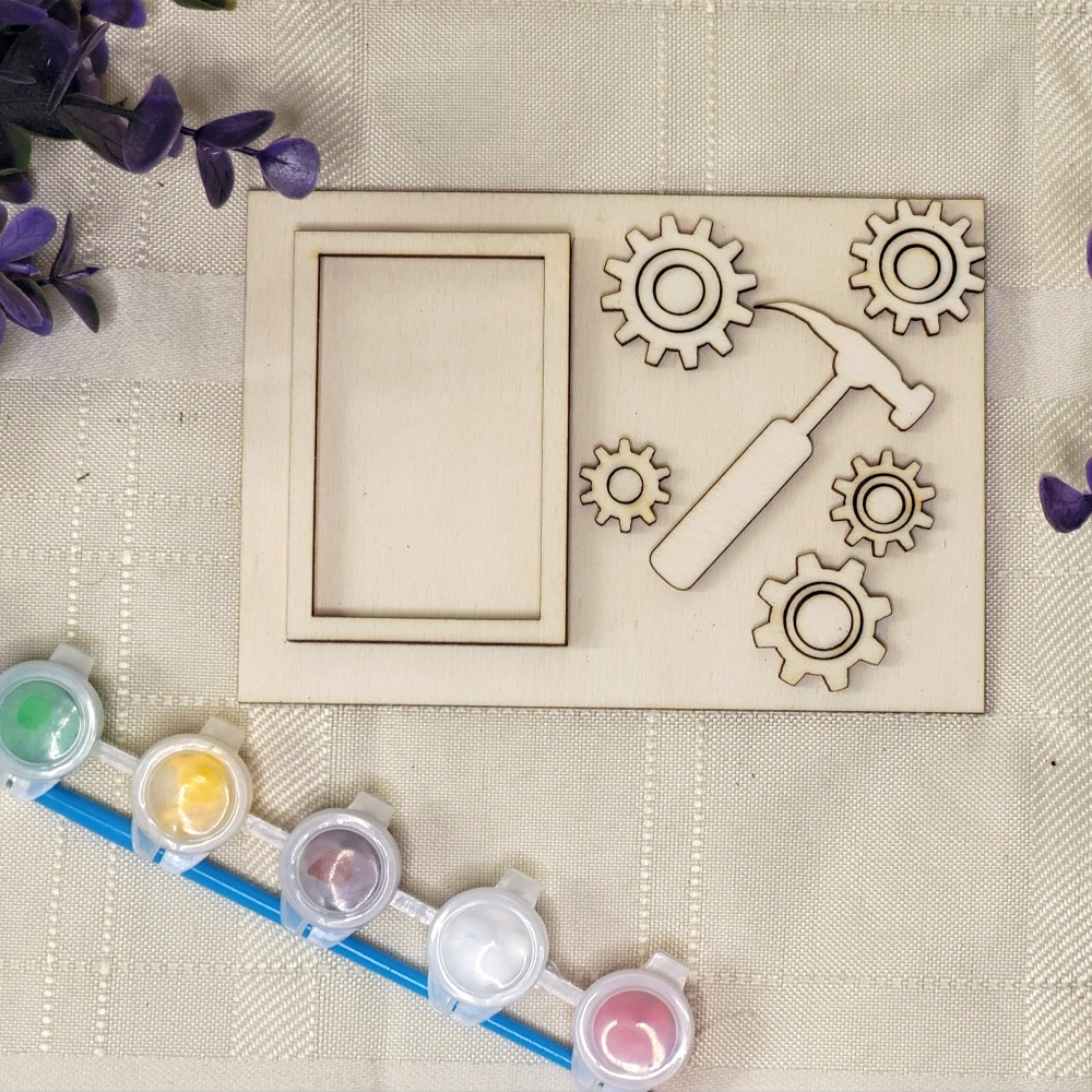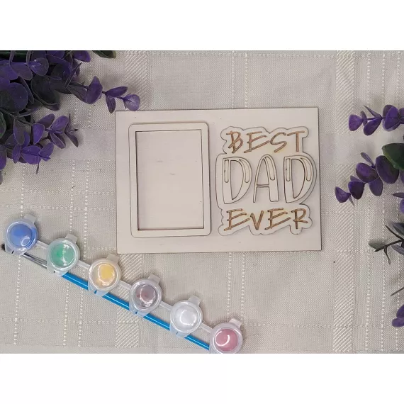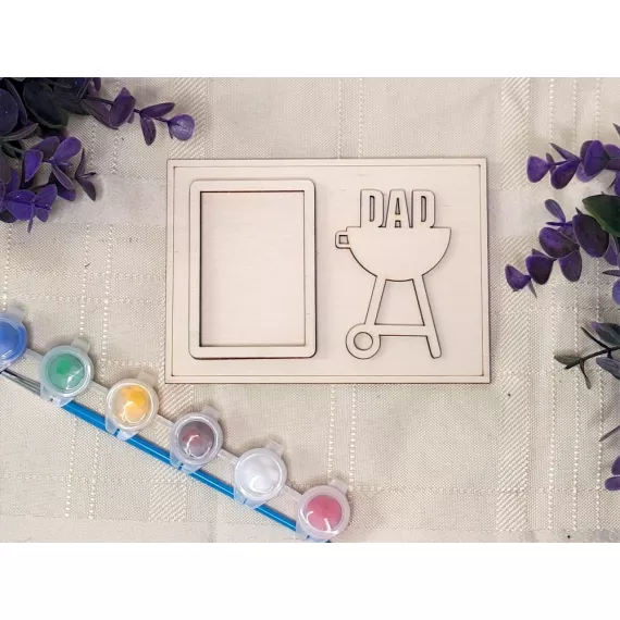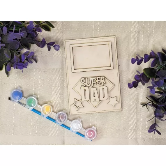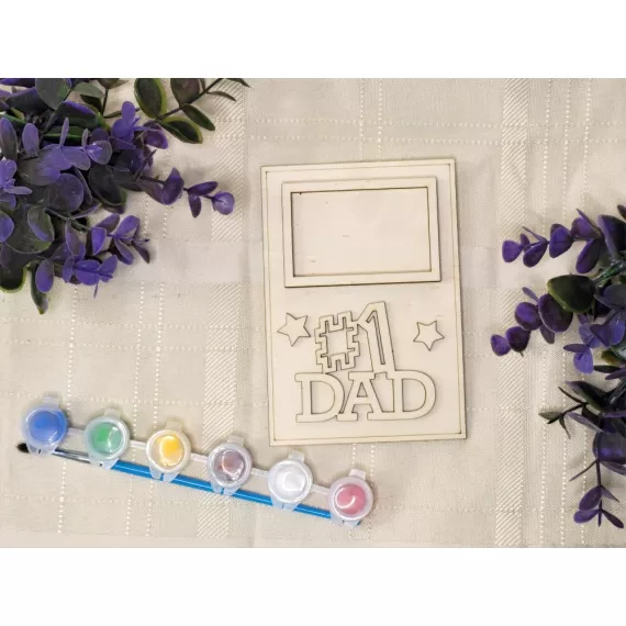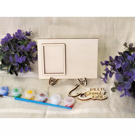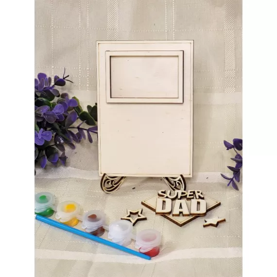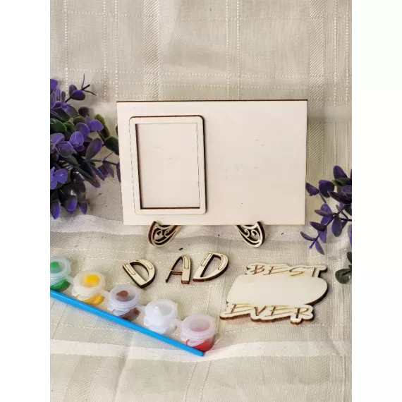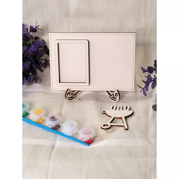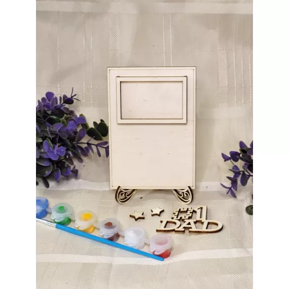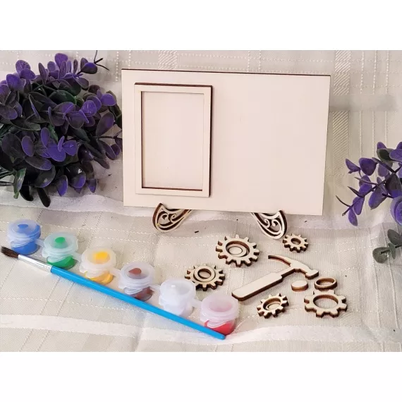 The kit contains a photo frame, a stand, the inscription of your choice, six colors and a painting brush.