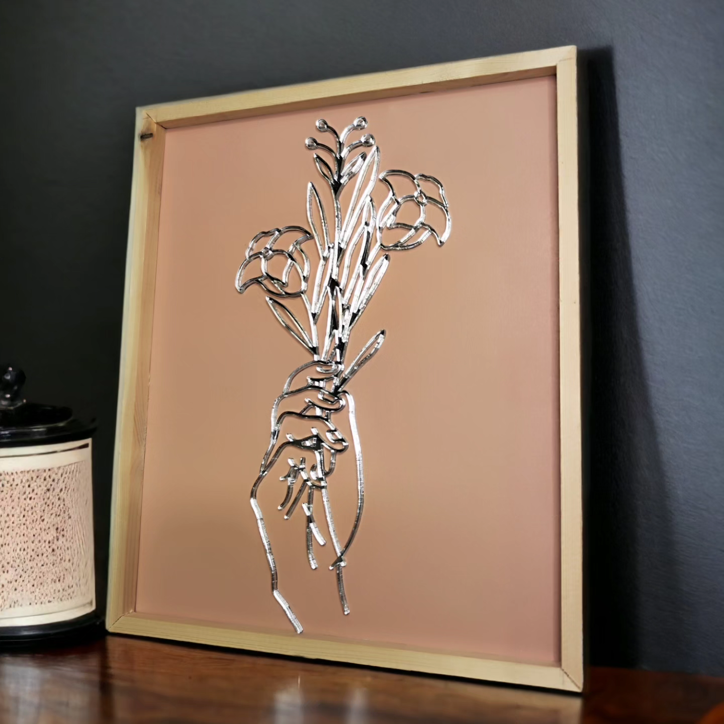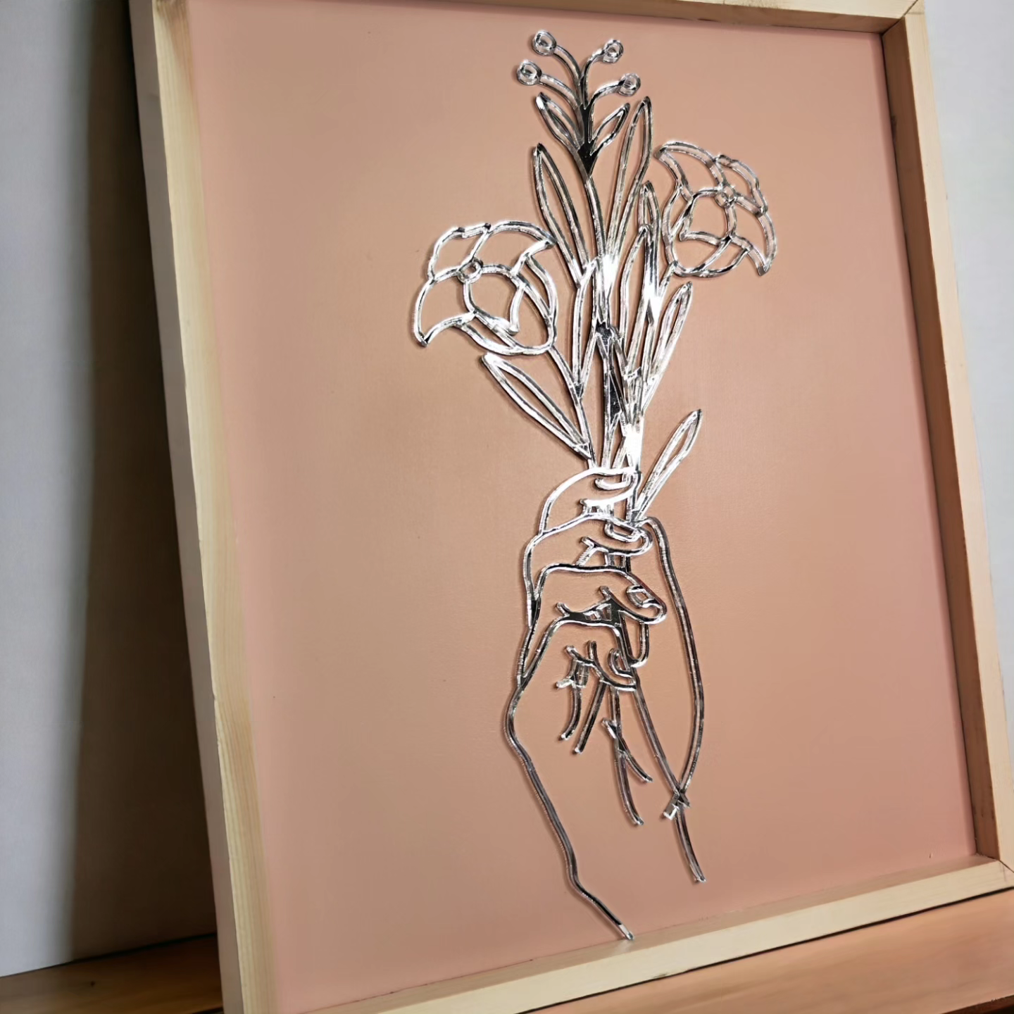 Mirrored acrylic cut with precision on my laser. The background is pink/terra cotta tone and is framed in natural stained wood. This frame design makes the perfect gift to a friend or yourself!