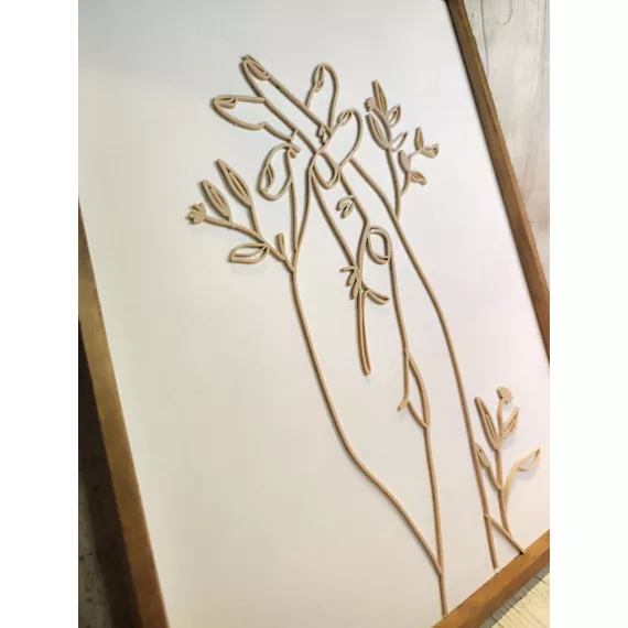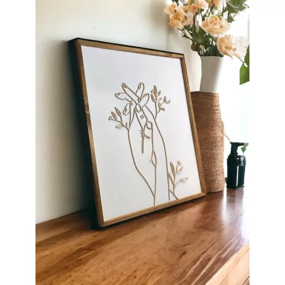 Matte acrylic in a beautiful natural "desert beige" colour cut on my laser. The background is white and is framed in dark oak wood. This frame design makes the perfect gift to a friend or yourself!
