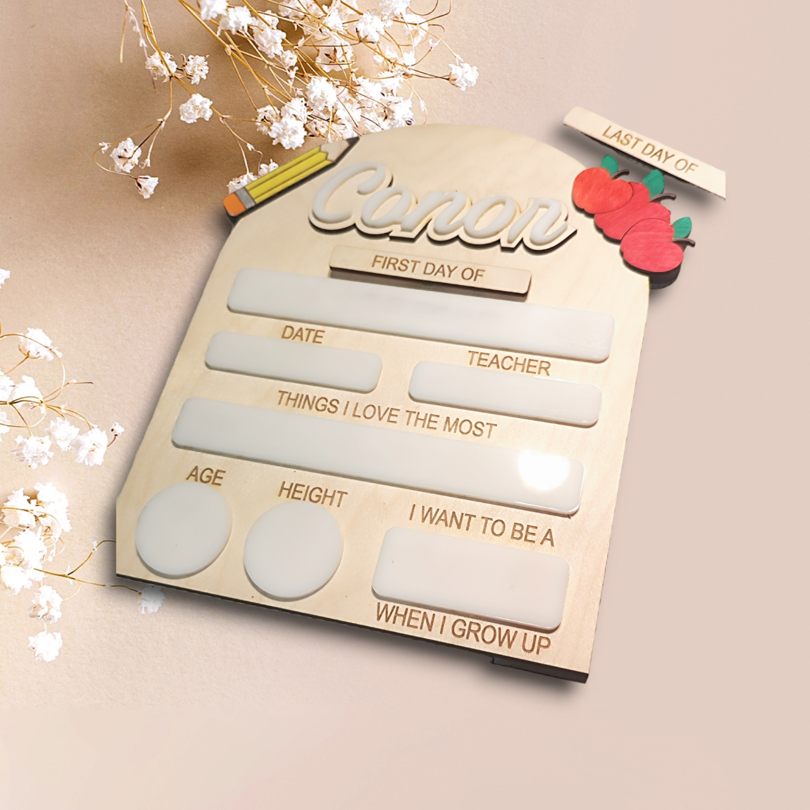 Introducing our Pencil / Apple Style First Day of School Dry Erase Sign! Crafted with love from sturdy 6mm plywood and adorned with charming acrylic accents, this sign is a perfect way to capture your child's first day of school memories.