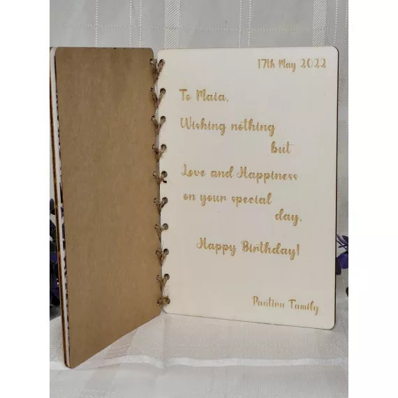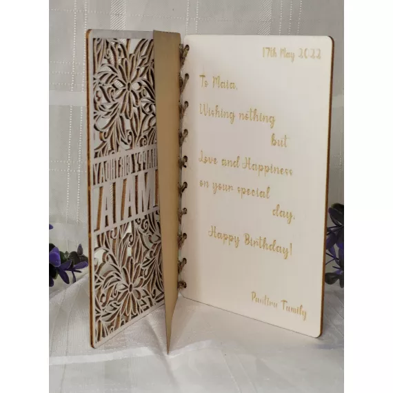 This premium personalised wooden card with engraved message will be a thoughtful addition to any gift. Can be personalised for birthday,  wedding,  anniversary or any other celebration.
