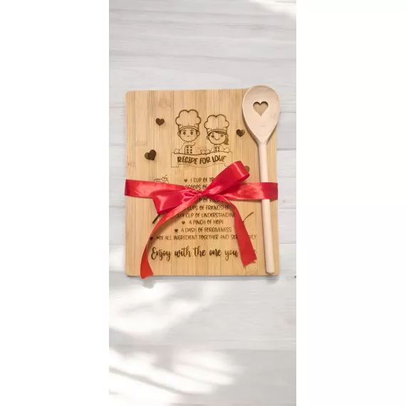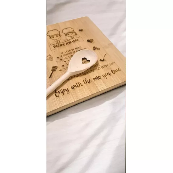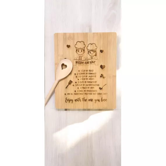 Celebrate love and create lasting memories with our "Recipe for Love" serving board and wooden spoon set – the perfect Valentine's Day gift! This beautifully crafted bamboo board features an adorable engraved recipe that symbolizes the ingredients for a happy relationship, making it a meaningful and unique gift for your partner, friends, or family.