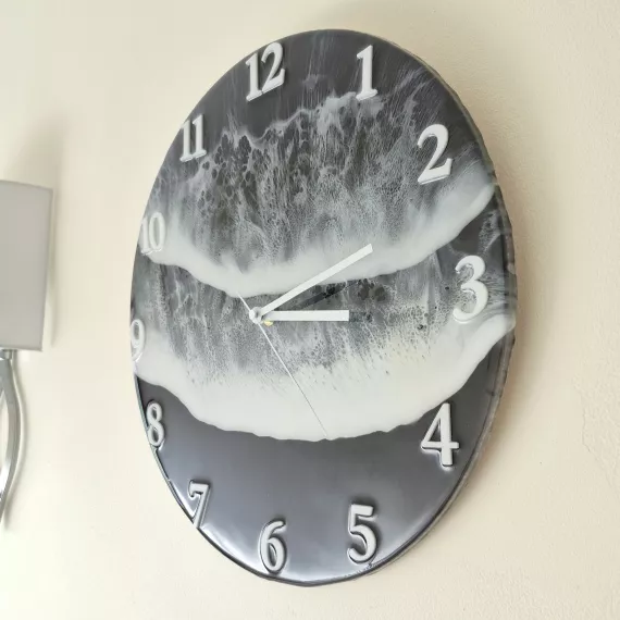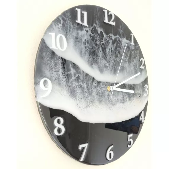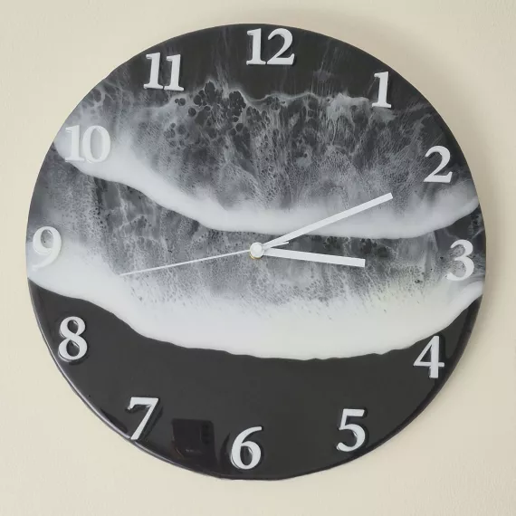 Enhance your décor with this stunning handcrafted resin wall clock, featuring a sleek black and white abstract wave design. The glossy resin finish creates a smooth, glass-like surface that adds depth and sophistication.