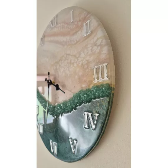 Enhance your décor with this stunning handcrafted resin wall clock. The glossy resin finish creates a smooth, glass-like surface that adds depth and sophistication.
