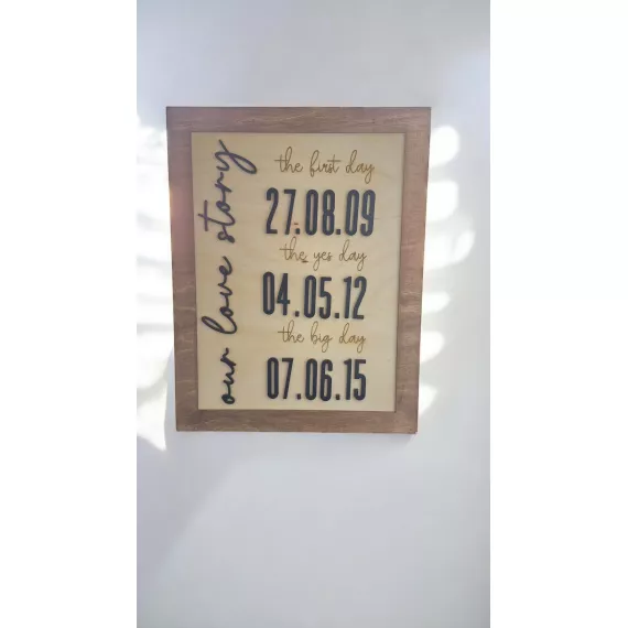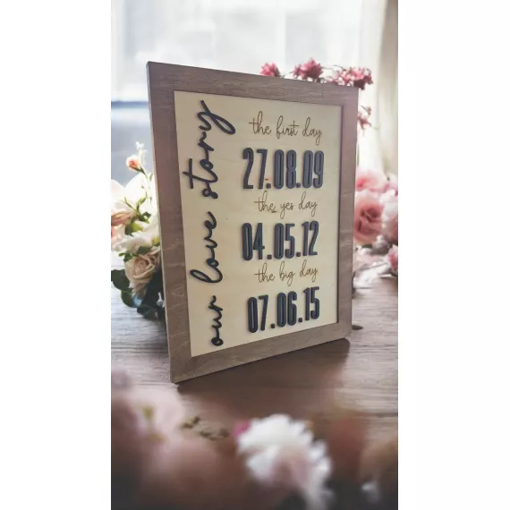 Celebrate the beautiful journey of love with this handcrafted wooden wall sign. Featuring a rustic wooden frame and elegant engraved lettering, this piece highlights three special dates: