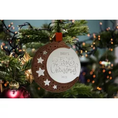 Celebrate your baby's first Christmas with our laser cut "First Christmas" tree decoration. Made from two layers of high-quality mirrored acrylic and plywood, this ornament adds a touch of elegance to your tree. The intricate laser cut design showcases the words "First Christmas" in a beautiful...
