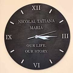 Our unique wall clocks in black and white colors are handmade out of noble birch. We use only environmentally clean wood, so these cool wall clocks are 100% eco friendly!  Personalised with name/s it will give a unique atmosphere to your home or it can be a wonderful gift for someone...