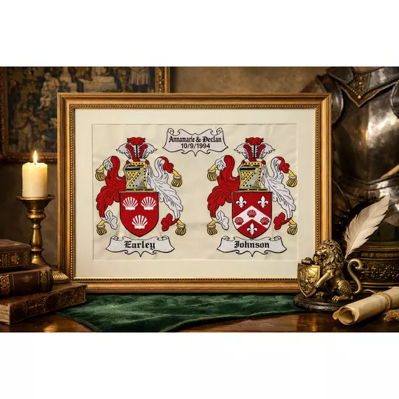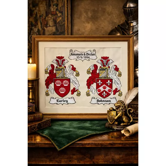 Celebrate your family history with a bespoke embroidered family crest, handcrafted in Ireland by Kildare-based artisan Kevin Earley. Each piece is meticulously stitched to order, transforming traditional heraldic designs into a timeless textile keepsake that honours ancestry, identity, and heritage.