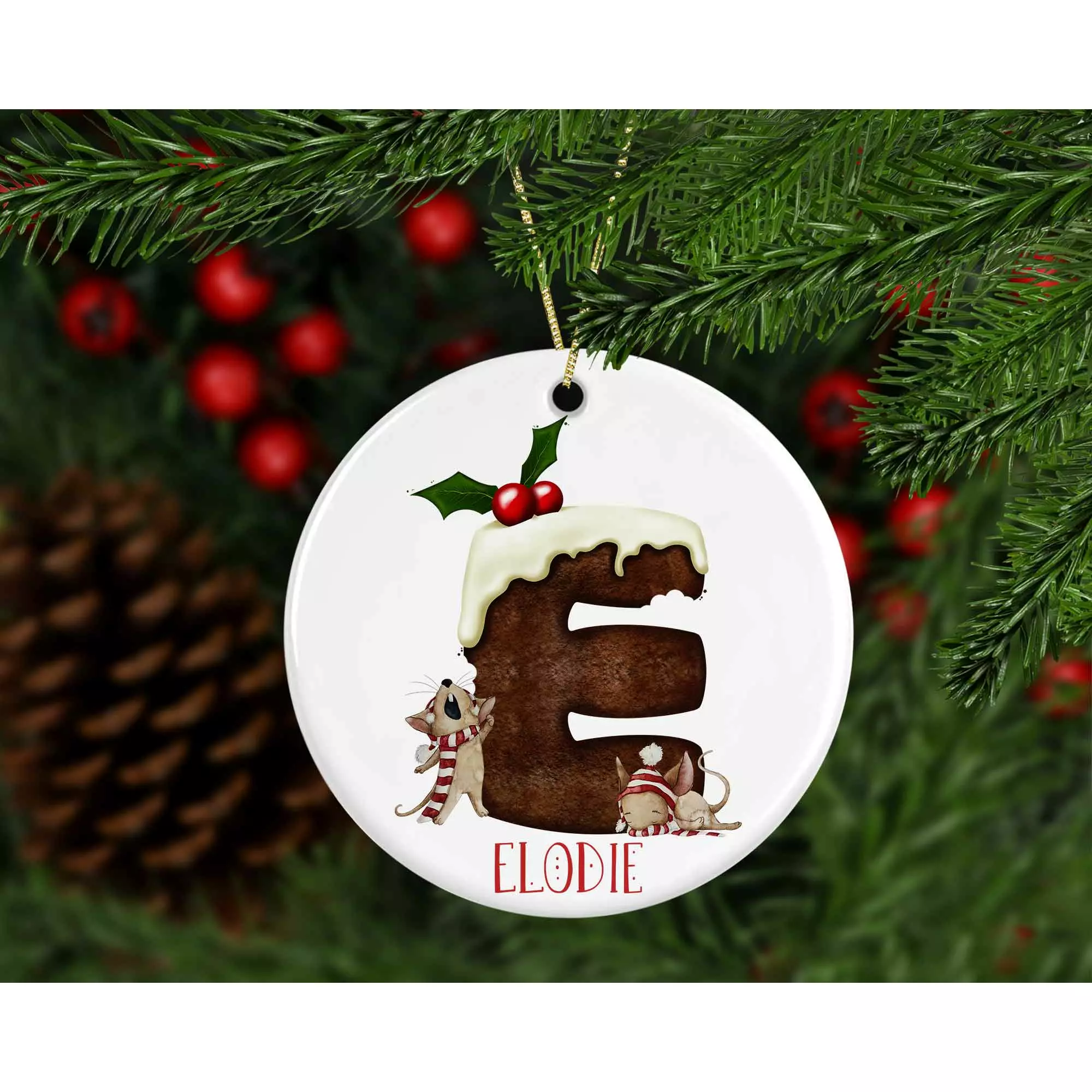 Add a whimsical touch to your tree with this tree decoration featuring a charming mouse and Christmas pudding design, personalised with your initial and your name.