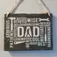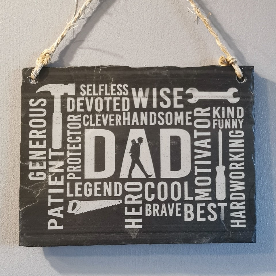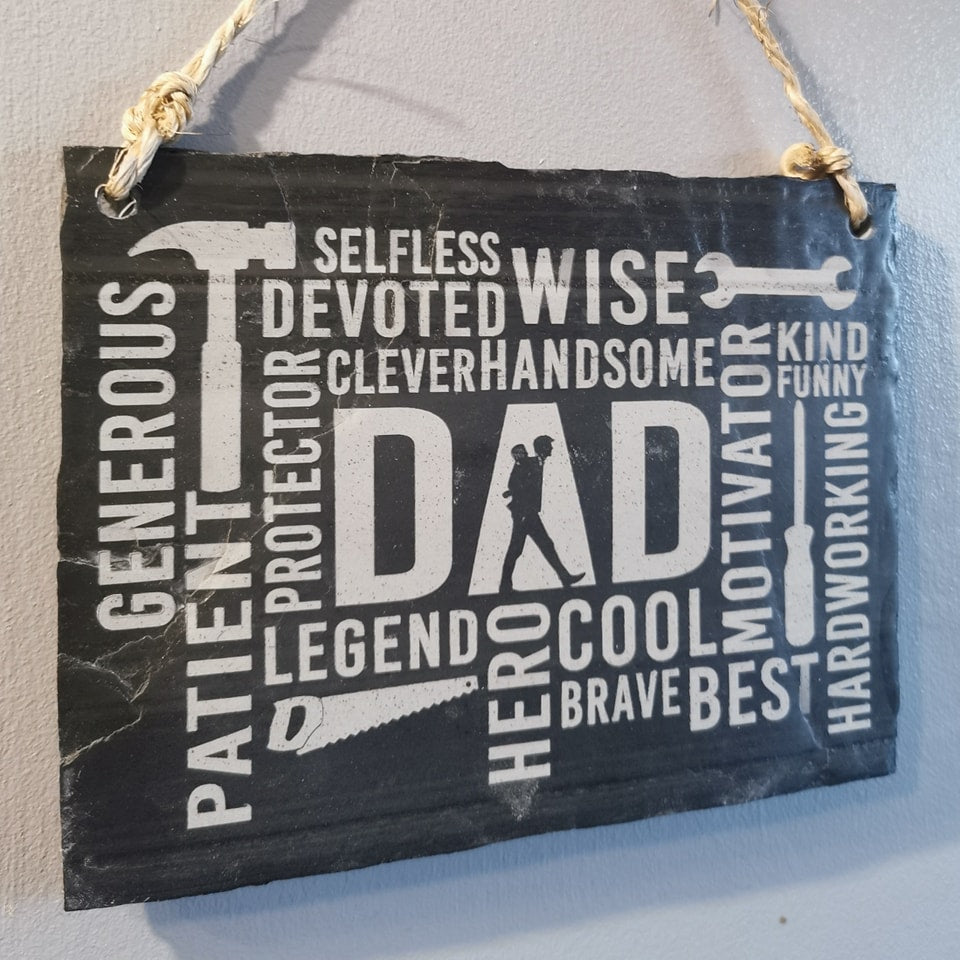 Our Father’s Tribute Donegal Slate is a robust 20cm x 15cm slab, hewn from the historic St Johnston mine and finished to a thickness of approximately 15mm. At its core, ‘DAD’ is etched, encircled by attributes that mirror his essence – Generous, Patient, Legend, Hero, Cool, Wise, and more.