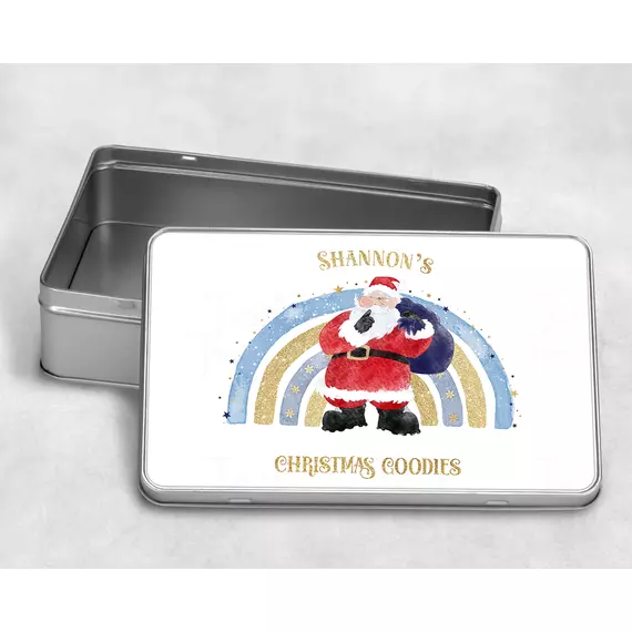 This tin, with a beautiful Green/blue Christmas rainbow design is perfect for filling with Christmas eve treats, or other goodies and makes a great addition to any Christmas Eve box.