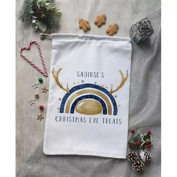 Personalised Navy and gold christmas reinbow christmas eve treat bag.