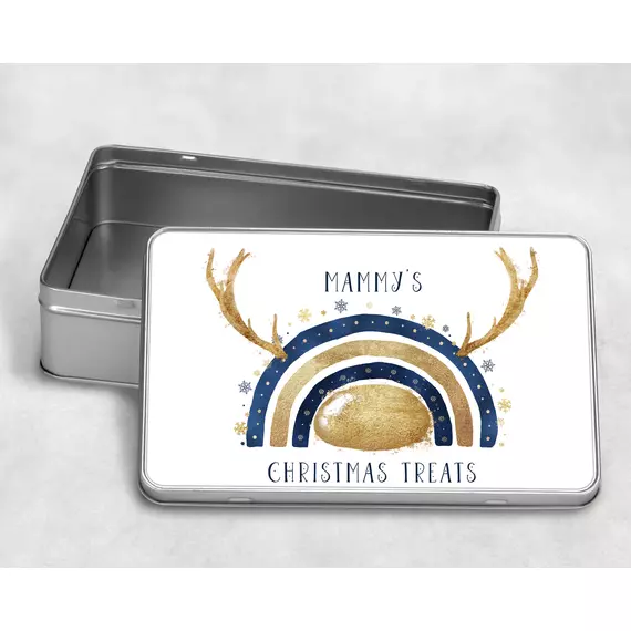 This tin, with a beautiful reindeer reinbow design is perfect for filling with Christmas eve treats, or other goodies and makes a great addition to any Christmas Eve box.