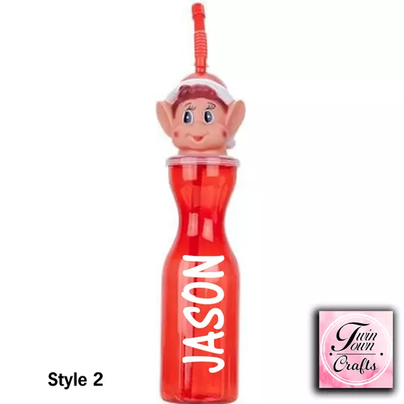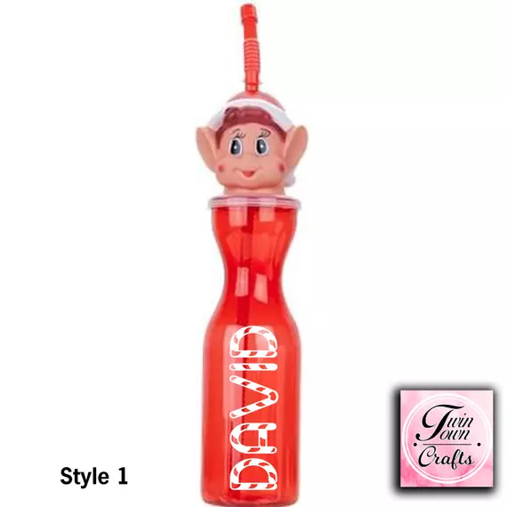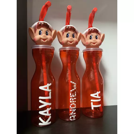 Our personalised elf bottles are 450ml and are made from a clear red plastic. Finished with an Elf head and red straw.