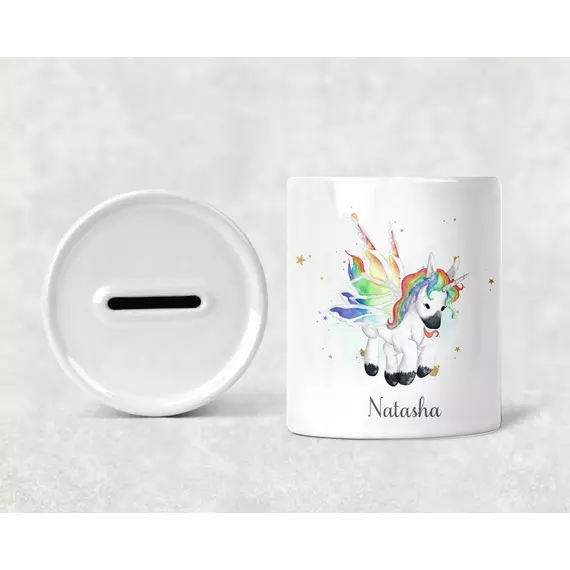 A beautiful unicorn money box, to be personalised with the name / text of your choice.