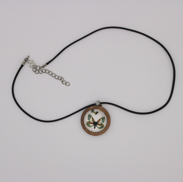 Created using butterfly picture and glass cabochon on wooden pendant with black leather string